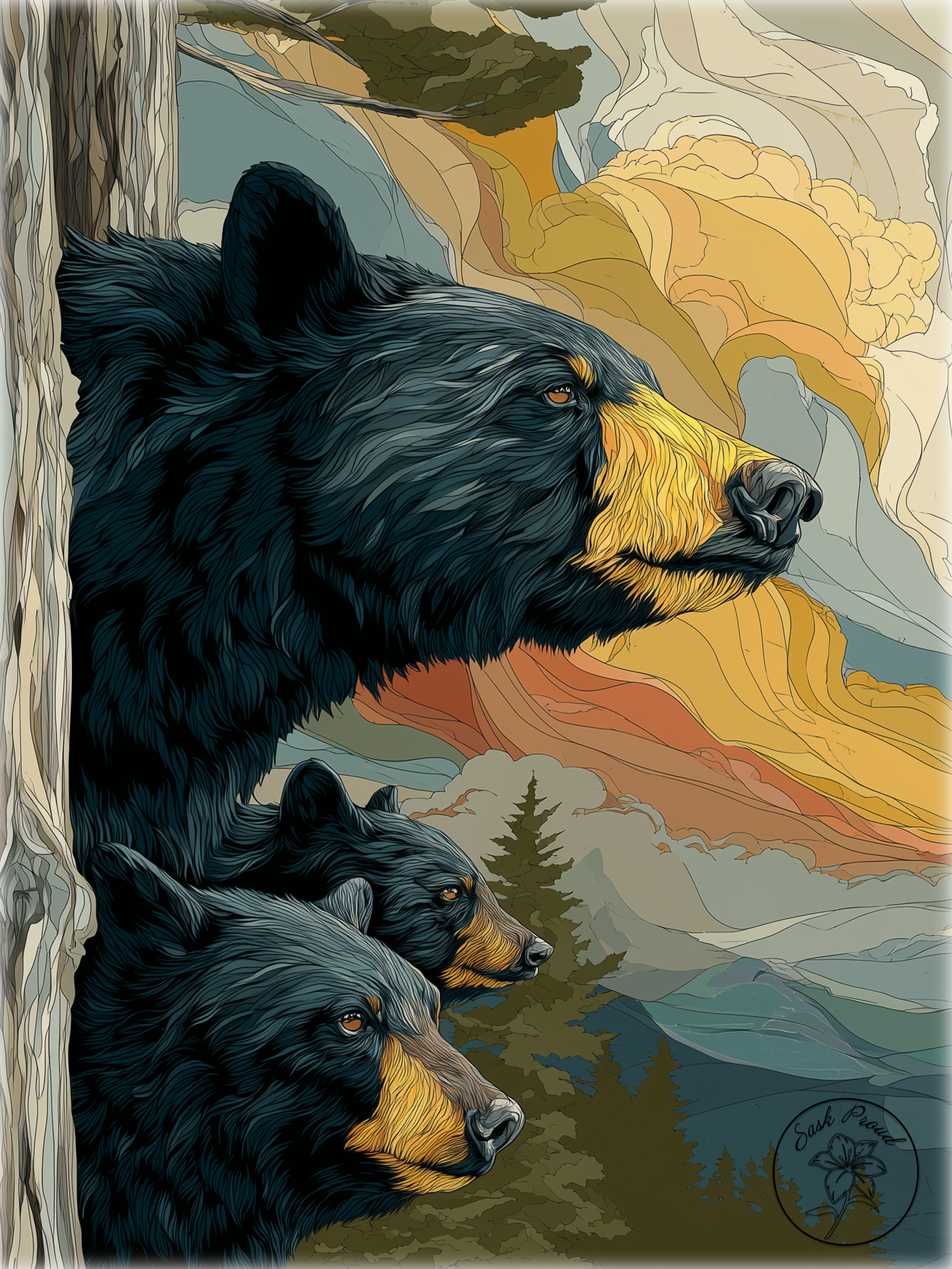 • Rhythmic contour lines that flow across every form, uniting sky, land, and subject.