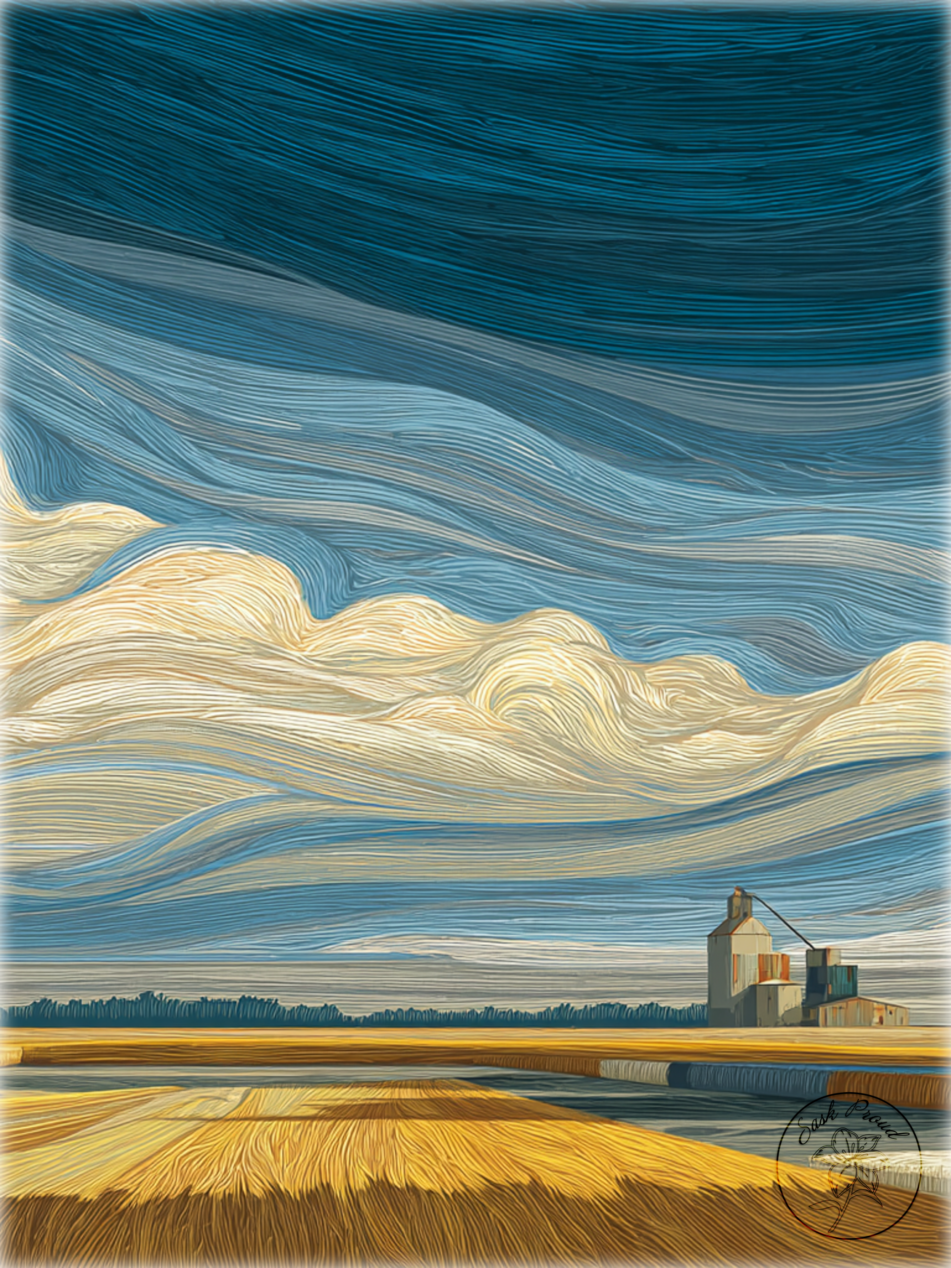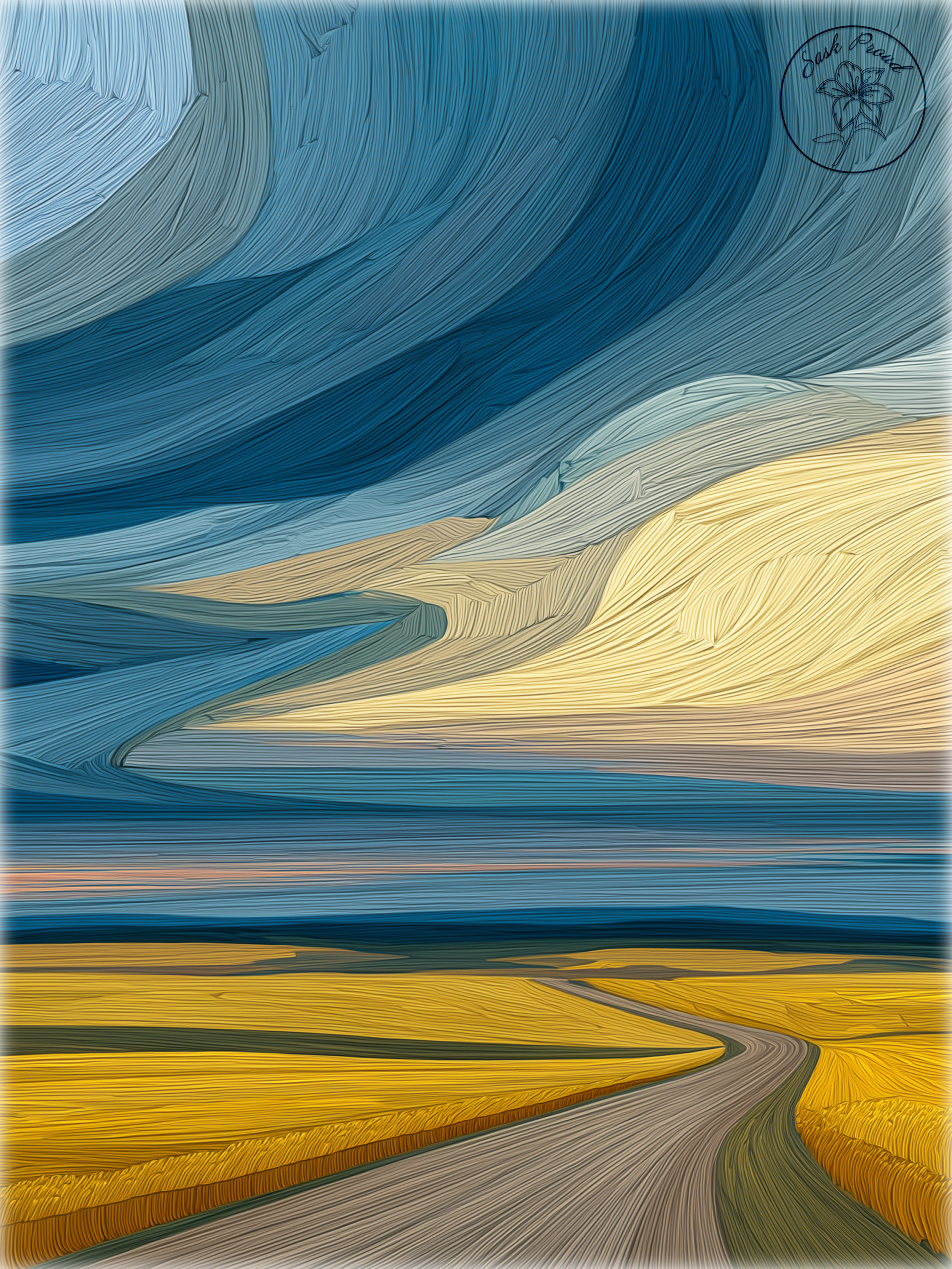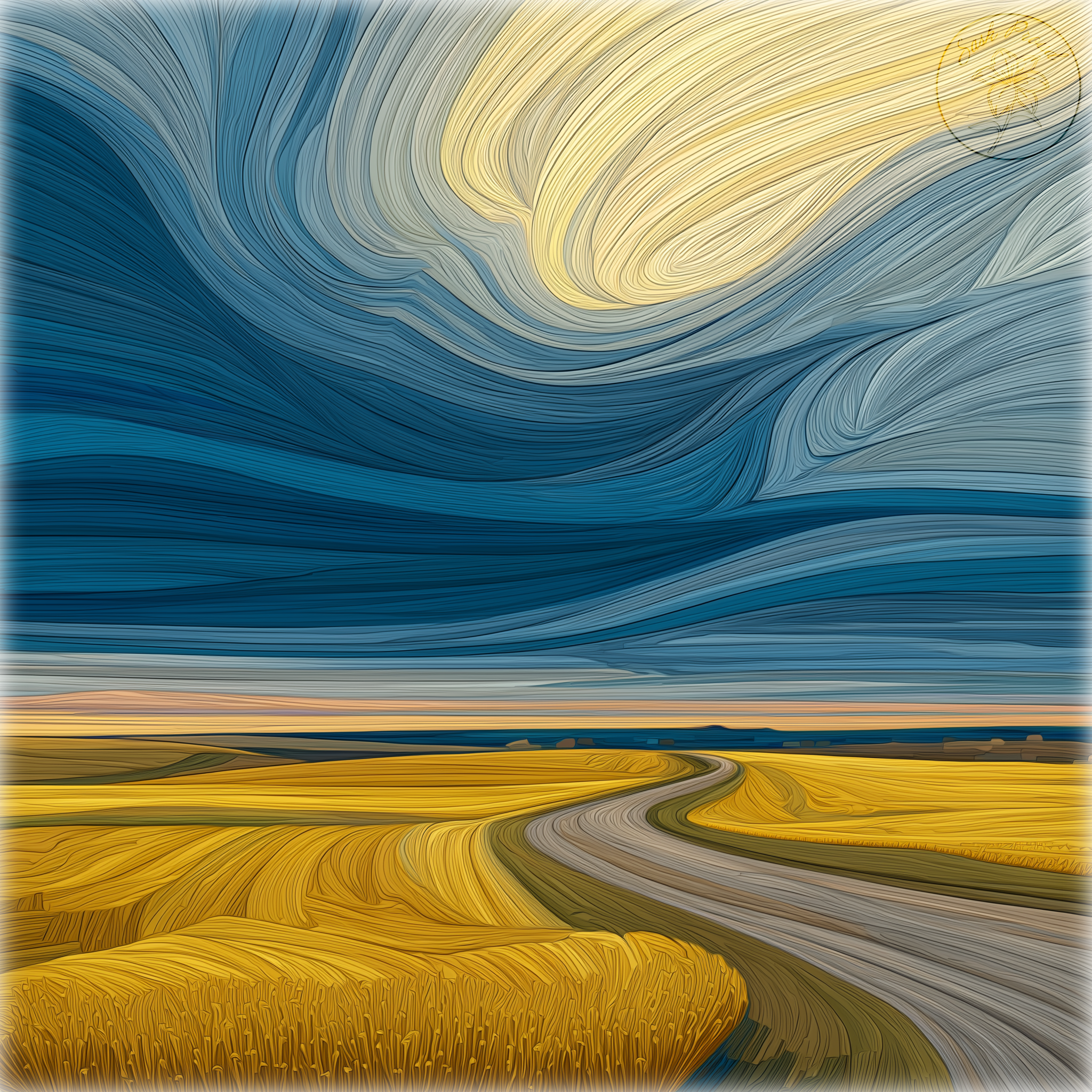 Born from the meeting of art and technology, Prairie Flow Style uses layered digital brushwork and directional contour lines to evoke the wind across wheat, the roll of cloud over horizon, and the unseen pulse of life beneath the surface. Every line moves with purpose, creating a sense of continuity between sky, land, and being.